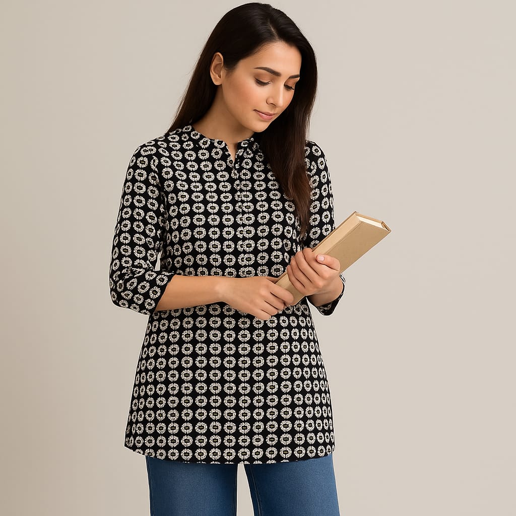 Discover elegance and comfort with our stunning Tunic Top/Short Kurti in black cotton, featuring a beautiful print that effortlessly blends traditional charm with contemporary style. The 30-inch length ensures a flattering fit, while the Mandarin collar adds a touch of sophistication. Perfect for pairing with leggings or pants, this versatile piece transitions seamlessly from casual outings to more formal settings. Elevate your wardrobe with this must-have piece that promises both flair and comfort, ideal for any fashion-forward individual.