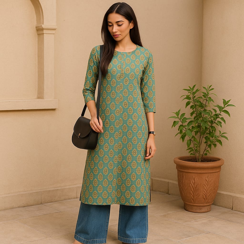 Introducing our Cotton Long Straight Cut Kurti, a blend of elegance and comfort. Crafted from premium cotton, this kurti features a serene green hand block print that adds a touch of artisanal charm. The straight cut design ensures a sleek silhouette, while the soft, breathable fabric offers all-day comfort. Perfect for both casual outings and special occasions, this kurti is a versatile addition to any wardrobe.