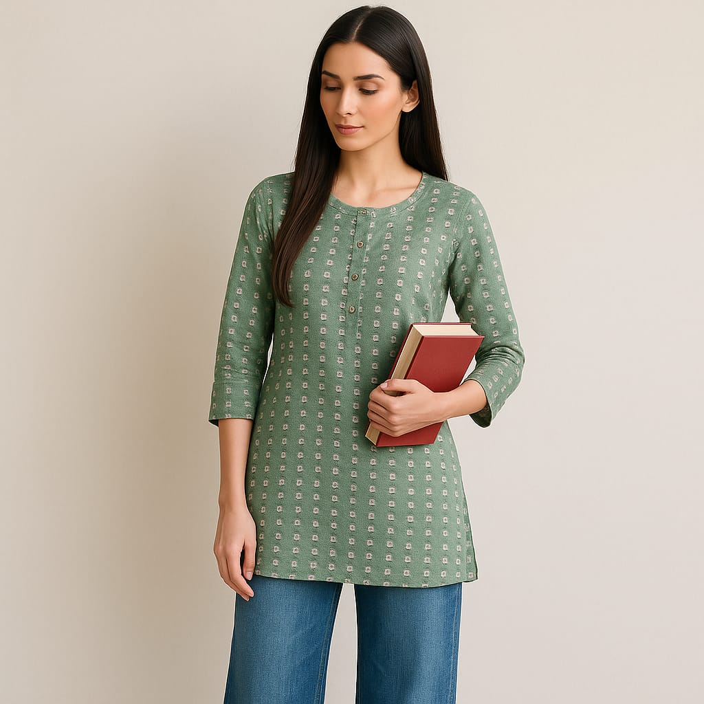 Discover elegance and comfort with our stunning Tunic Top/Short Kurti in Green cotton, featuring a beautiful print that effortlessly blends traditional charm with contemporary style. The 30-inch length ensures a flattering fit, while the Mandarin collar adds a touch of sophistication. Perfect for pairing with leggings or pants, this versatile piece transitions seamlessly from casual outings to more formal settings. Elevate your wardrobe with this must-have piece that promises both flair and comfort, ideal for any fashion-forward individual.