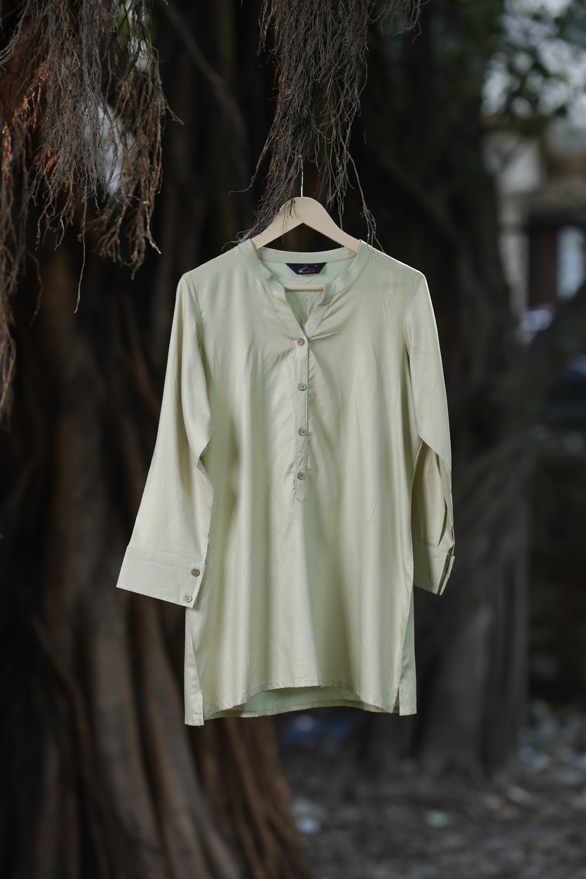 Made using High quality printed cotton blend fabric, adorned with Mandarin collar. Light green colored , with golden print gives a complete look. This tunic top provides you all day comfort .