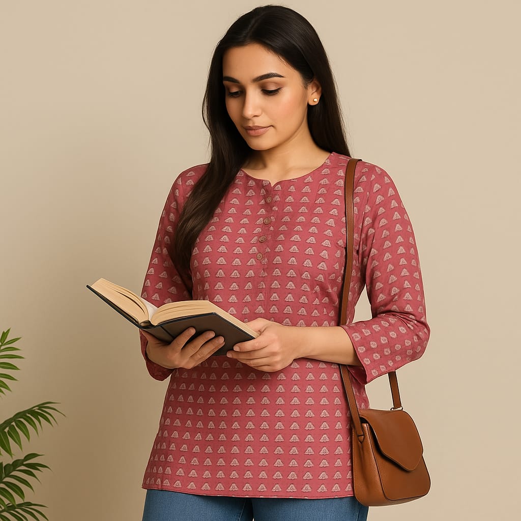 Discover elegance and comfort with our stunning Tunic Top/Short Kurti in Maroon cotton, featuring a beautiful print that effortlessly blends traditional charm with contemporary style. The 30-inch length ensures a flattering fit, while the Mandarin collar adds a touch of sophistication. Perfect for pairing with leggings or pants, this versatile piece transitions seamlessly from casual outings to more formal settings. Elevate your wardrobe with this must-have piece that promises both flair and comfort, ideal for any fashion-forward individual.