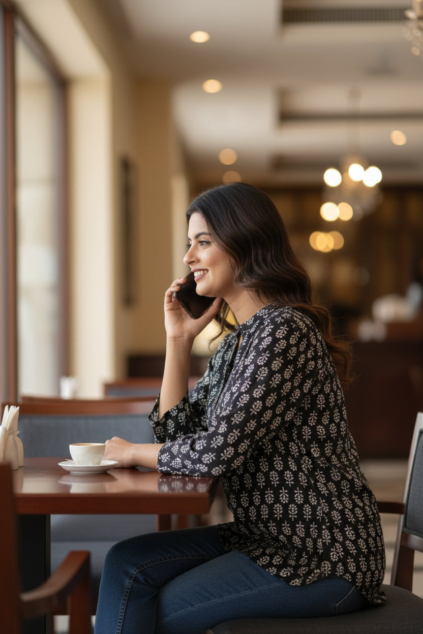 Made using High quality printed cotton blend fabric, adorned with Mandarin collar. Black colored print gives a complete look. This tunic top provides you all day comfort.