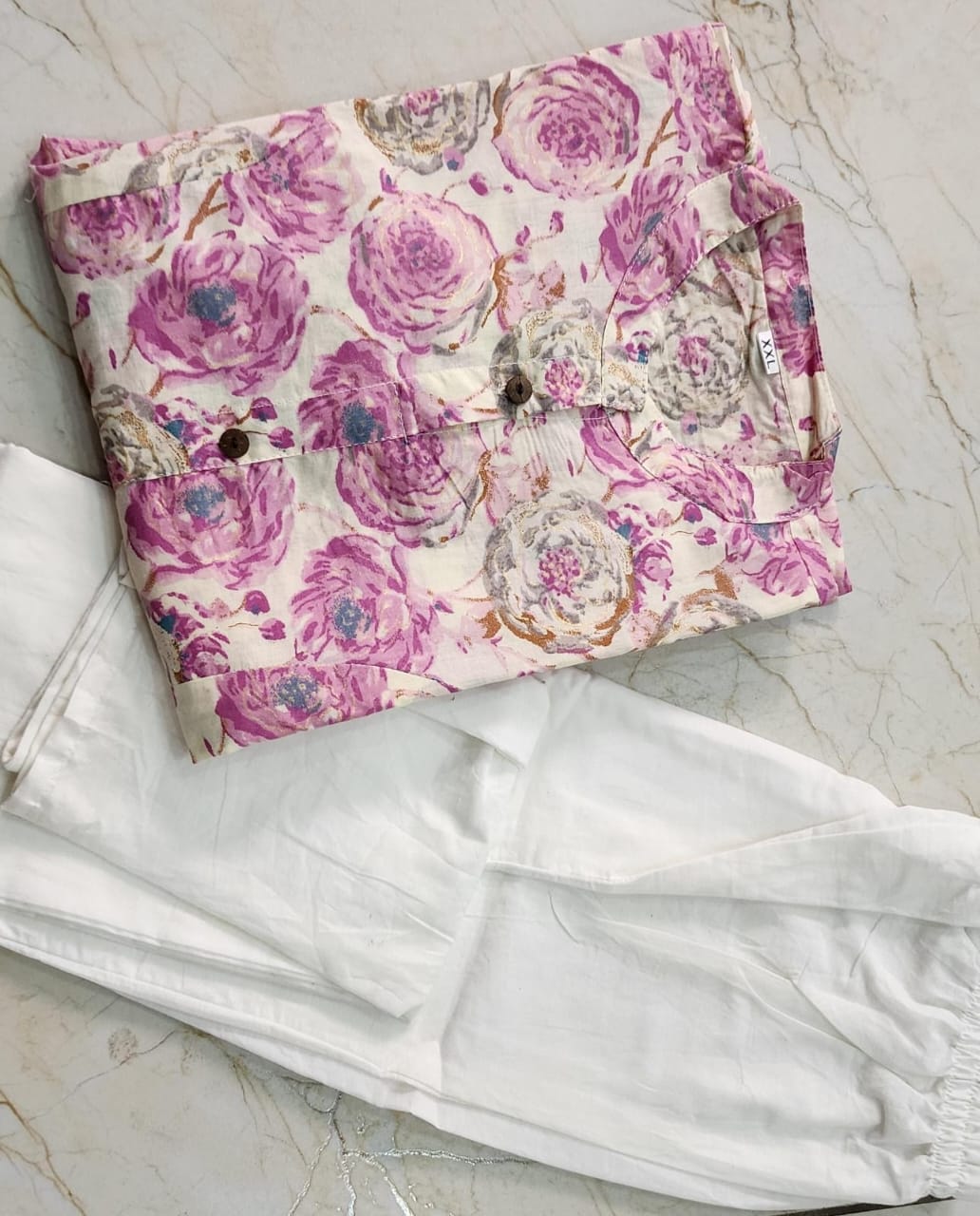 This stylish A- line cotton kurta-pant set offers both comfort and versatility. The A line cut kurta features 3/4th sleeves and a classic design, perfect for both office wear and casual outings. The matching white cotton pants provide a relaxed fit, ensuring all-day comfort. Easy to wash and wear, this set is the ideal choice for anyone seeking a blend of practicality and style.