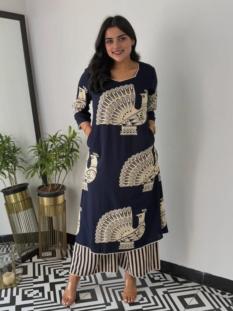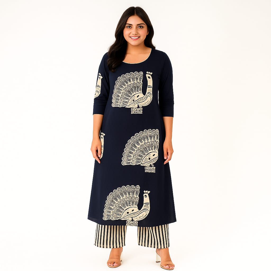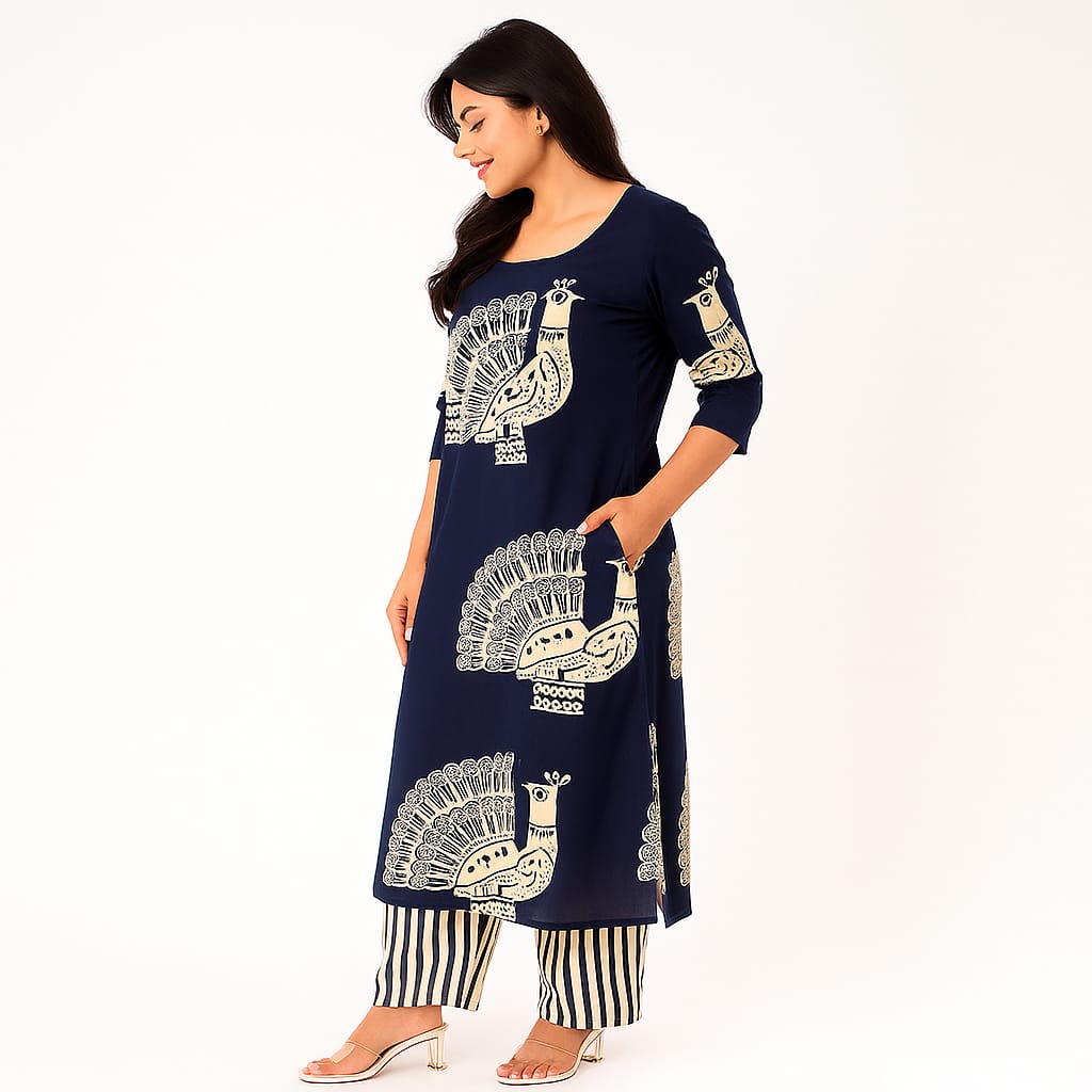 Experience effortless style and comfort with the Blue Peacock Infy Coord Set. Crafted from soft cotton fabric, this set features a blue kurta with a classic round neckline paired with striped printed pants. Designed for all-day wear, it offers a breathable and relaxed fit, making it ideal for both casual outings and comfortable home wear. Elevate your wardrobe with this versatile and stylish ensemble.