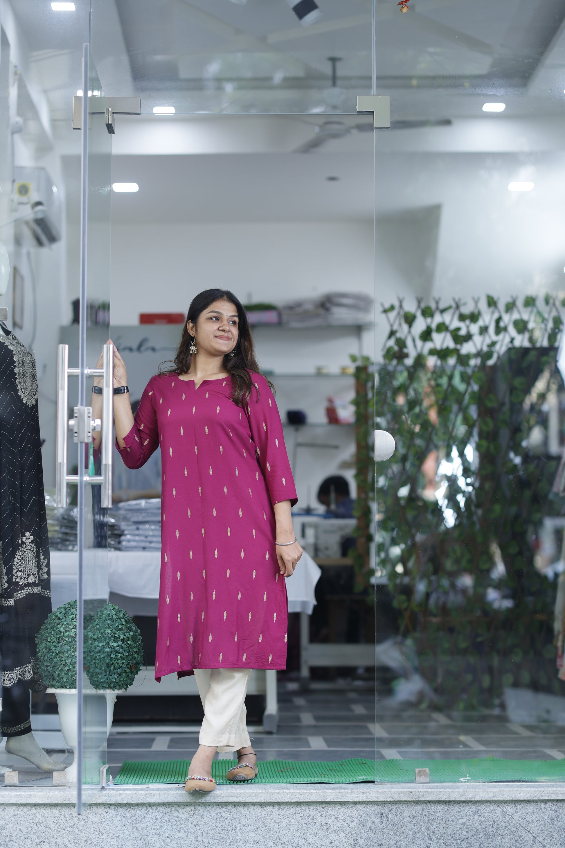 This kurti is a casual/office wear helps you to work comfortable. It is loving Rayon fabric with round neck with straight hem. Its comfy fit and its beautiful purple color with golden print make it more attractive. Fabric is tested for worthfullness.. "Extra margins are there to alter if needed.