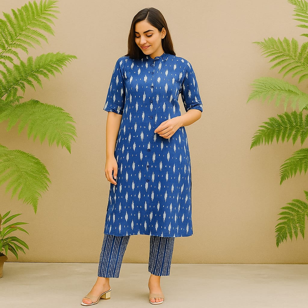 This Shree Blue Aline Coord Set features a vibrant Blue hue crafted from breathable cotton fabric, ensuring comfort throughout the day. Designed with a mandarin collar and button detailing, it offers a polished look. The set includes functional pockets, combining style with practicality, and a relaxed fit that enhances ease of movement. Perfect for those seeking a blend of elegance and everyday functionality.