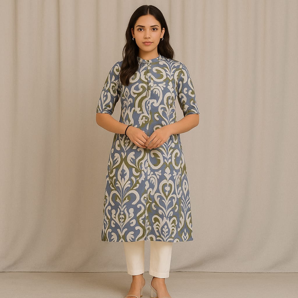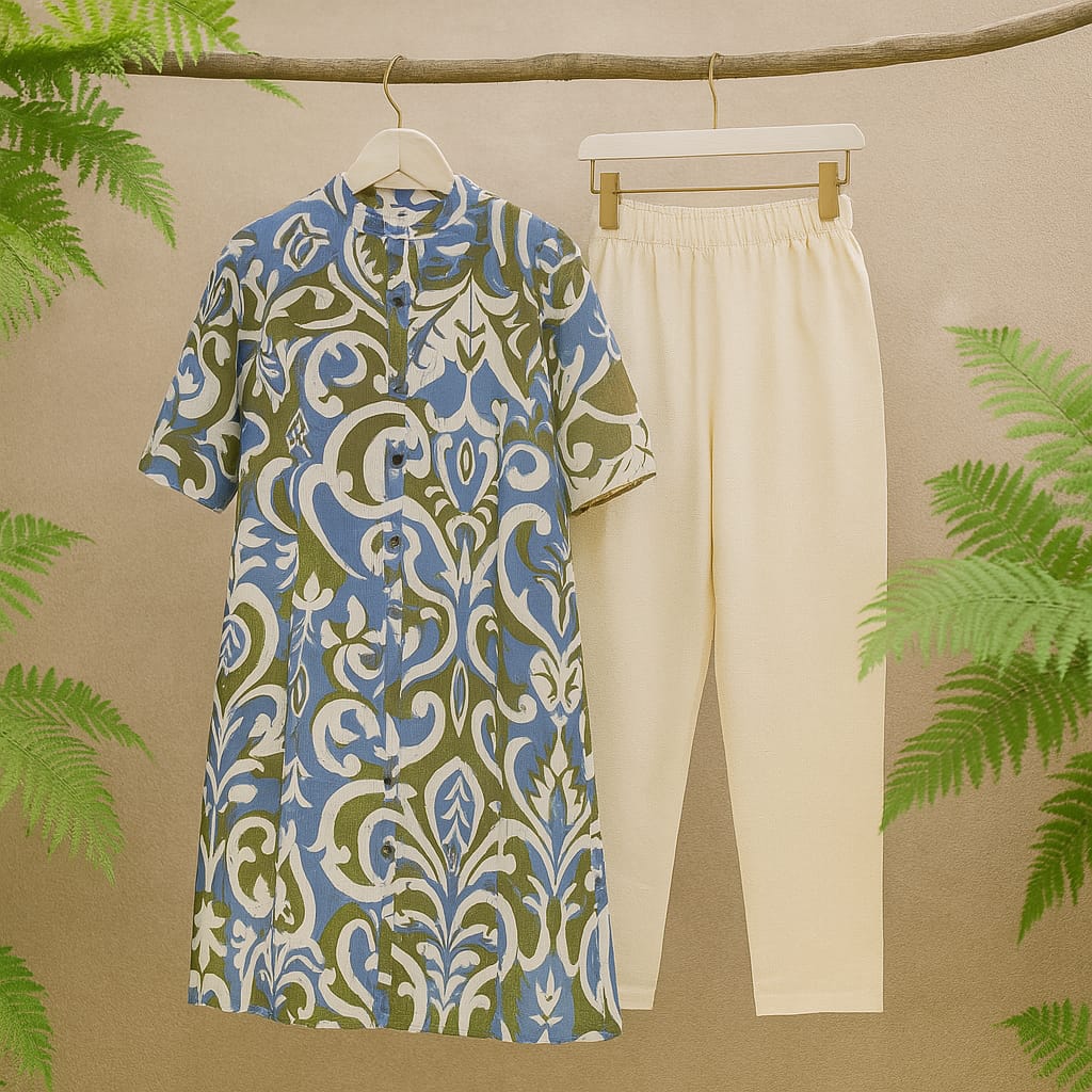 This Shree Engi Aline Coord Set features a vibrant Blue with bold english print hue crafted from breathable cotton fabric, ensuring comfort throughout the day. Designed with a mandarin collar and button detailing, it offers a polished look. The set includes functional pockets, combining style with practicality, and a relaxed fit that enhances ease of movement. Perfect for those seeking a blend of elegance and everyday functionality.