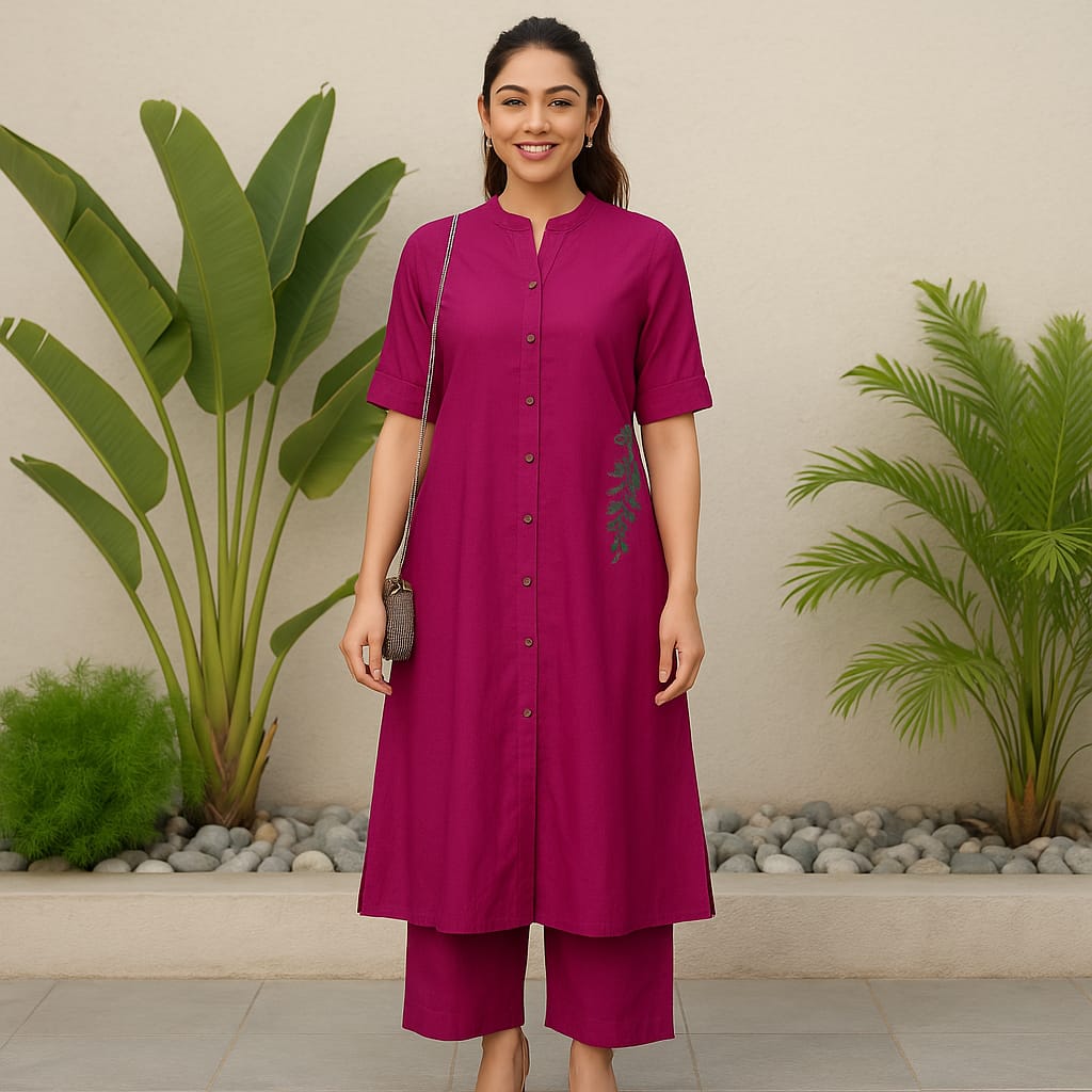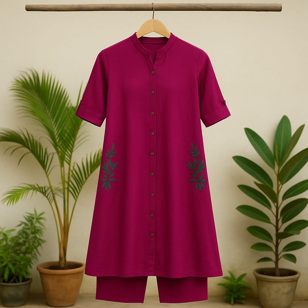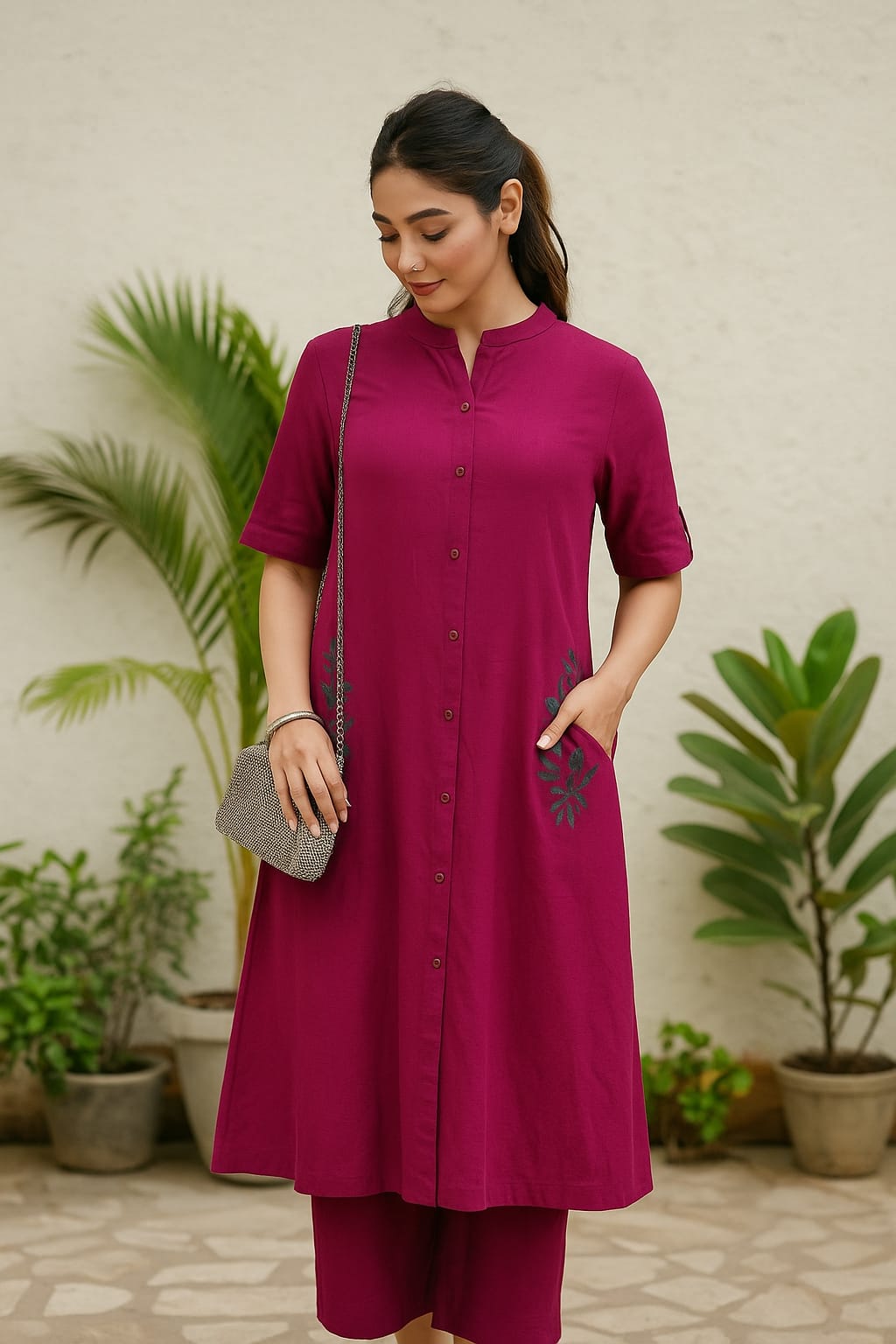 This Solid Pink Alina Coord Set features a vibrant magenta pink hue crafted from breathable cotton slub fabric, ensuring comfort and durability. The A-line silhouette is enhanced with delicate embroidery on the pockets, adding a refined touch to the design. Perfect for those seeking a blend of style and ease in their wardrobe.