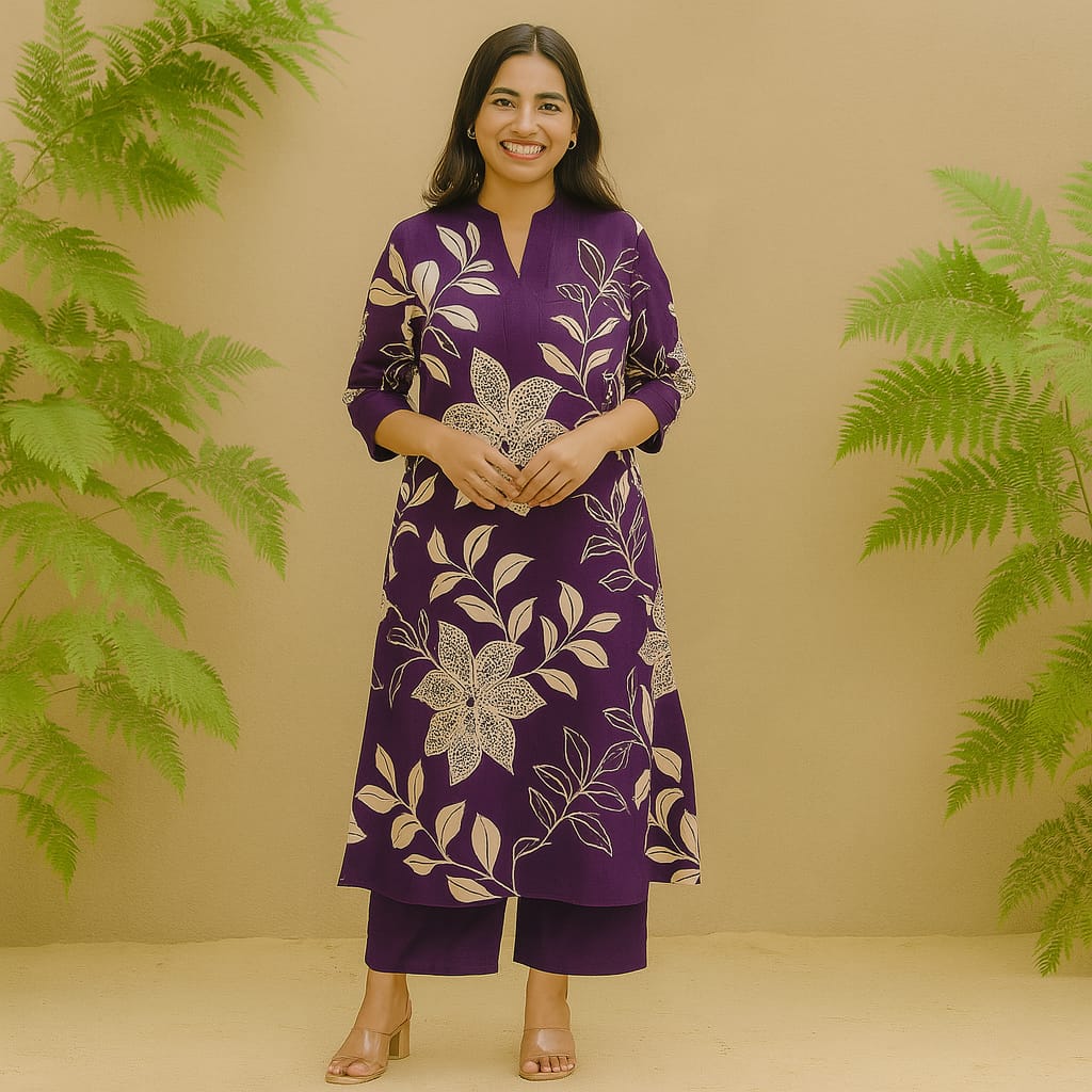 This Purple Floral Infy Coord Set features a comfortable fit crafted from soft cotton fabric, ensuring breathability and ease of wear. The elegant floral print adds a fresh, vibrant touch, while the distinctive Mandarin neckline enhances its sophisticated appeal. Presented in a soothing yellow shade, this set combines style and comfort for everyday elegance.