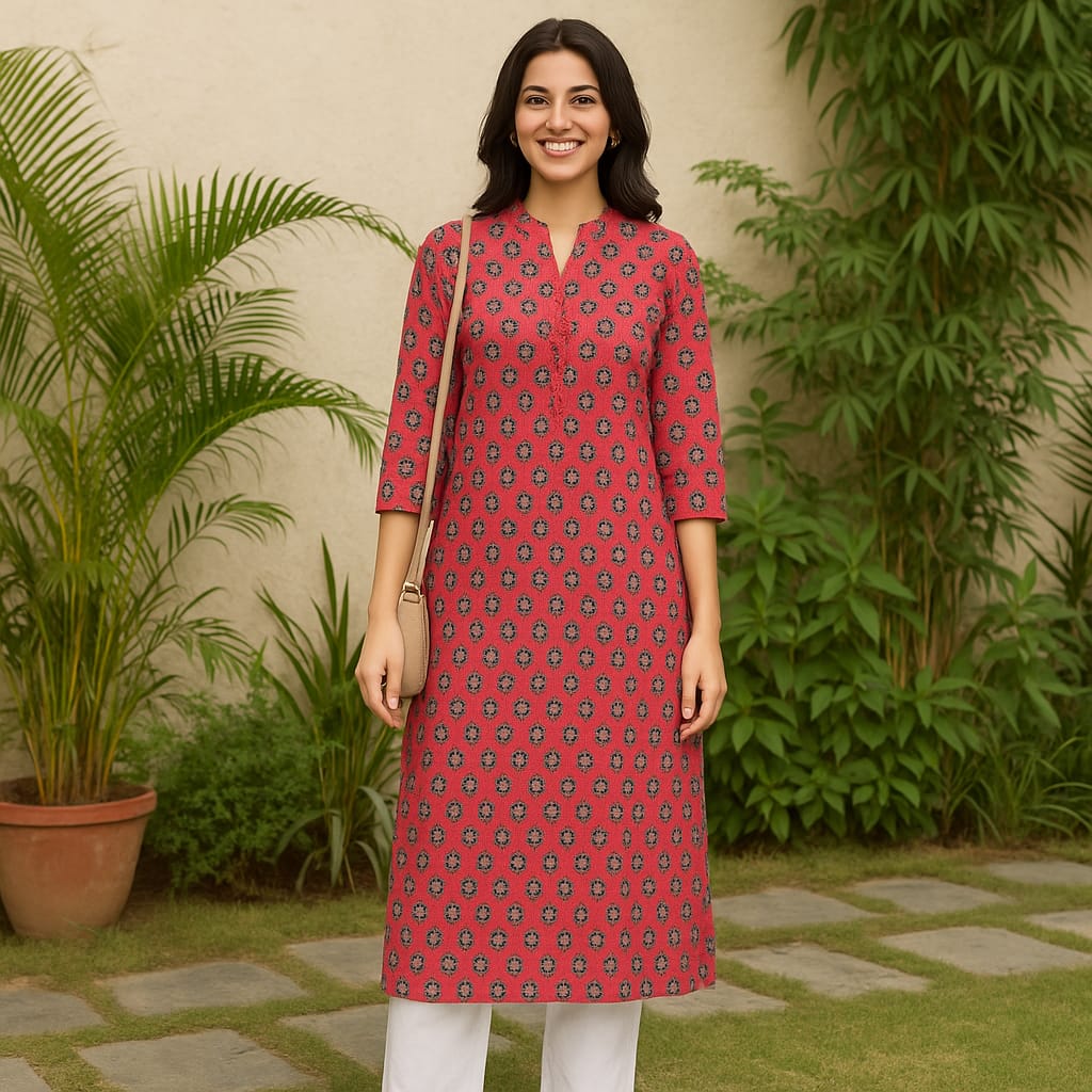 Crafted from premium cotton, this Red/ Ggajari kurta features a distinctive blue floral print that adds subtle texture and style. Its straight cut offers a flattering silhouette, ensuring comfort and ease of movement. Ideal for both casual and semi-formal occasions, this kurta combines quality fabric with expert design for a refined look.